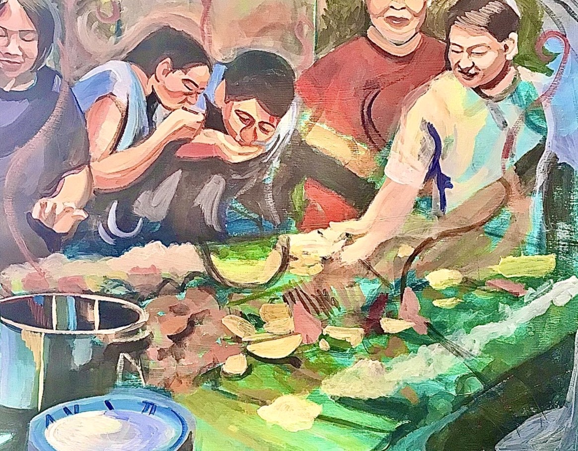 Inspiration: A capture of my Filipino-American family having a birthday dinner for my father and tita. This was my first time experiencing a Kamayan dinner, where everyone eats with their hands. The meal typically consists of rice and colorful dishes presented on banana leaves.